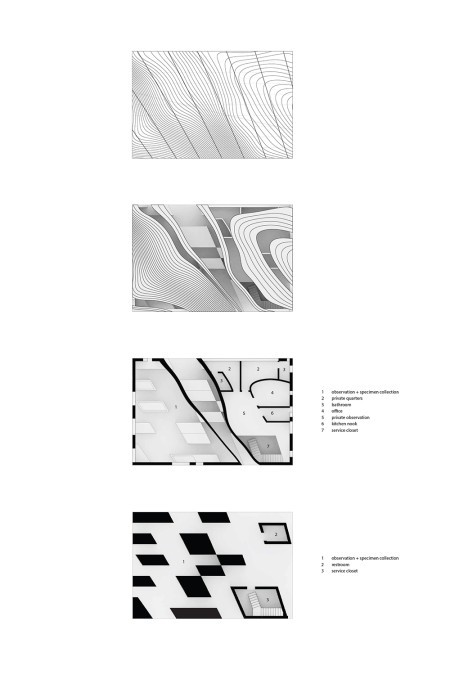 The form of the visitor center/residence was derived from two sets of topography lines, one set being the lines that are contained by the building footprint (1:1 scale) and the other set being taken from the site at 12 times the building footprint. The second set of lines was then scaled down to 1:12 to fit within the footprint. With the scalar difference between the two sets of lines being so great, different form-making processes were applied. Being the more graphically “interesting” of the two, the 1:12 lines were used to create enclosure/facade. They were folded around the building with subtractions pertaining to programmatic requirements of the residence and views from the observation area. The 1:1 lines were divided in 4′ increments and the spaces between them were then extruded to meet the enclosure.