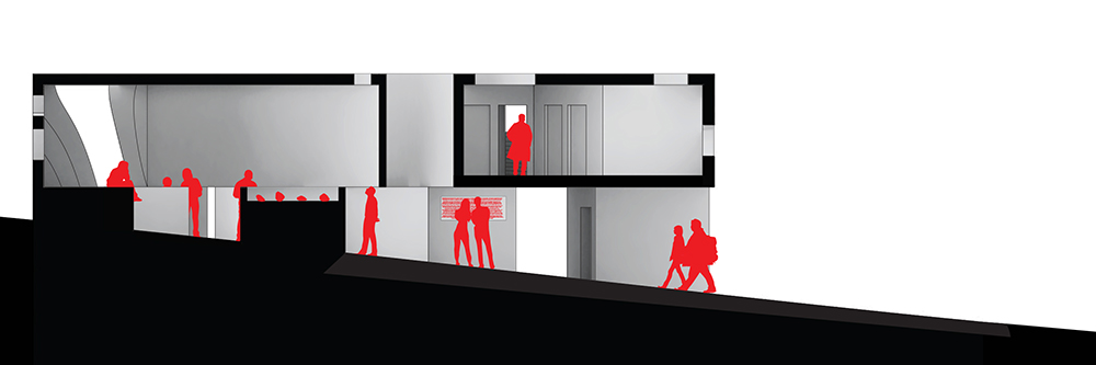 As visitors enter from the east side of the building, beneath the scientists’ residence, they find themselves walking between 7′ to 9′ high concrete masses. The 8′ and 9′ masses contain a service closet and restroom, while the 7′ masses are used to display specimens and information about the site. As visitors meander between the masses and up the slope, the space compresses until they are no longer beneath the residence and are briefly in an unenclosed area. Their procession continues to the observation room. In this vast, open space with the lines of the site surrounding the visitors, more specimens are held, but because the extrusions are now at lower heights, visitors instead look down at them. As visitors move from specimen to specimen, they catch glimpses of the site through the openings of the enclosure. They can also gather and rest here, as the lowest extrusions (2′ to 3′) encourage sitting. Visitors leave with a greater understanding of the site that they have immersed themselves in and continue down the path.